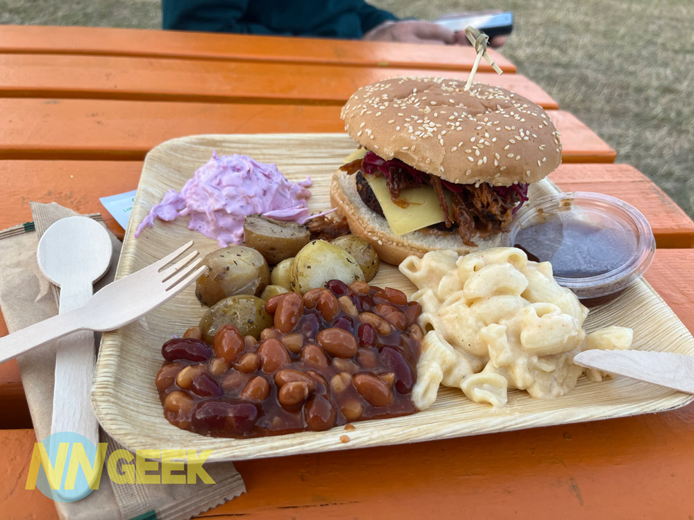 I had my eye on the food offering inside The Retreat area that I’d spotted the night before. This was provided by The Moody Cow, and I decided to try their signature Moody Burger which was a smoked beef pattie with pulled pork and cheese and an array of sides – garlic potatoes, slaw, pit beans and mac ‘n’ cheese.